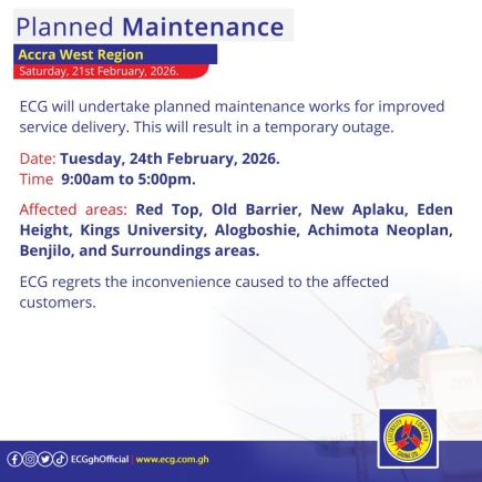 On Tuesday, February 24, the outage during the same hours will impact "Red Top, Old Barrier, New Aplaku, Eden Height, Kings University, Alogboshie, Achimota Neoplan, Benjilo, and Surroundings areas."