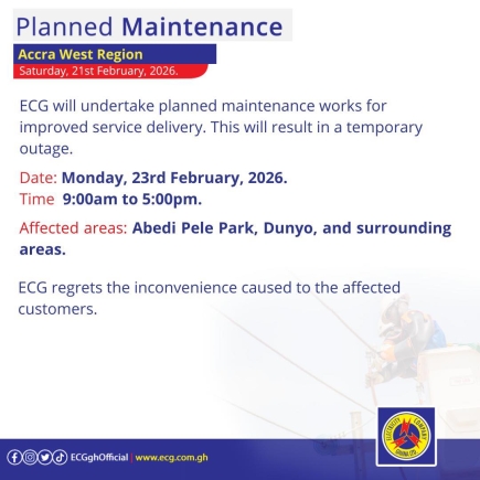 In the Accra West Region, an emergency maintenance exercise is scheduled for Sunday, February 22, from 9:00am to 5:00pm, affecting "Latter Day Saint HQS, Ghana Immigration Service, Alisa Hotel, Swiss Embassy, WAEC, and surrounding areas." The planned maintenance for the week begins on Monday, February 23, from 9:00am to 5:00pm, with "Abedi Pele Park, Dunyo, and surrounding areas" set to be affected.