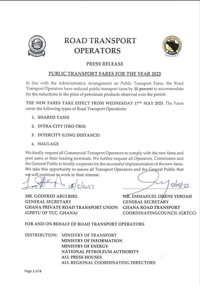 In a press release issued on Monday, May 15, the Road Transport Operators announced their decision. The statement, jointly signed by Emmanuel Ohene Yeboah, General Secretary of the Ghana Road Transport Coordinating Council, and Godfred Adulbire, General Secretary of the Ghana Private Road Transport Union (GPRTU), emphasized that the fare adjustment aligns with the "Administrative Arrangement on Public Transport Fares," taking into account the observed reductions in petroleum prices during this period.