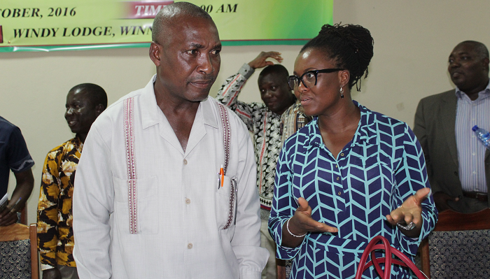 Mr Anthony Amuzu, Deputy Government Statistician (Operations) (left), Mrs Teki Akuetteh Falconer, Executive Director, Data Protection Commission (right), having an interaction after the launch