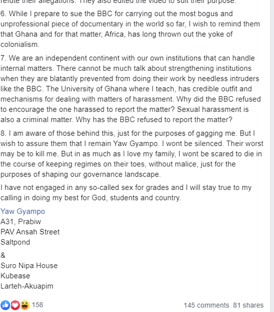 A political science lecturer at the University of Ghana (UG), Professor Ransford Gyampo says he will not be gagged by persons he claims to be behind the “sex for grades” documentary by the BBC.