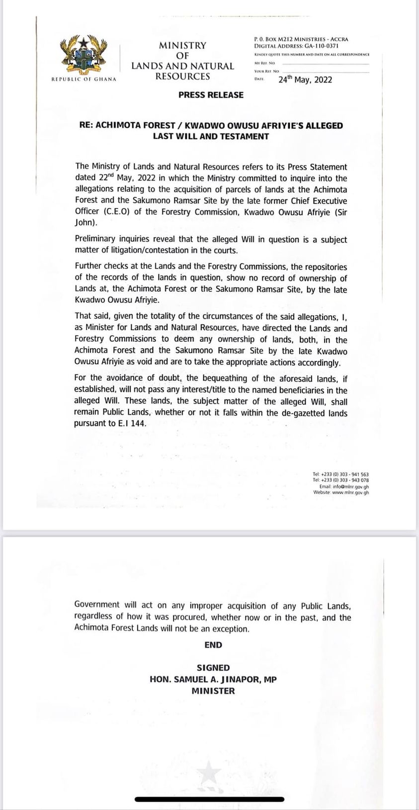 The Ministry in a press statement signed by the Minister of Lands and Natural Resources, Samuel A. Jinapor said its preliminary inquiries into the alleged will had revealed that the matter was the subject of litigation in the courts, adding that the late Sir John did not own any lands at the Achimota Forest or the Sakumono Ramsar Site.