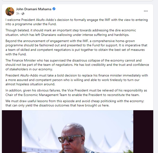 Former President John Dramani Mahama has welcomed the decision of President Nana Addo Dankwa Akufo-Addo to commence formal engagements with the International Monetary Fund (IMF) on an economic support programme.
