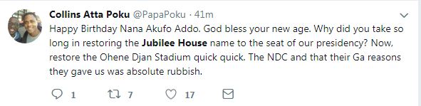 Another with the handle "@ElvisKwakuAtta: also tweeted "We have missed the road folks. What's significant about name changing? Is it, the most important now? Flagstaff house to Jubilee house doesn't create jobs or reduce price of fuel at the pump"