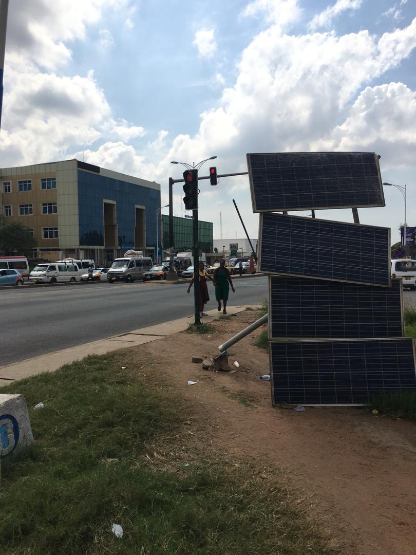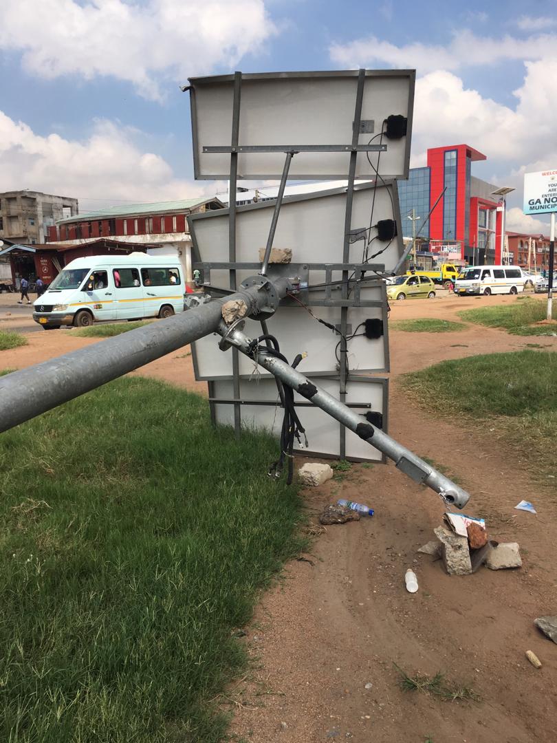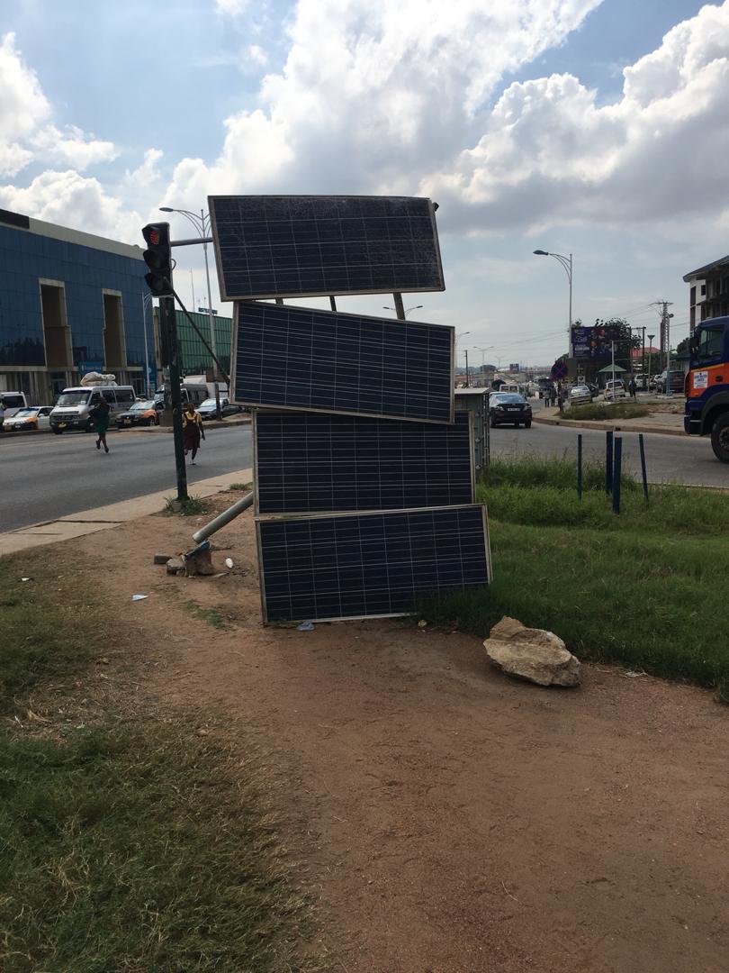 The solar system which powers traffic lights at the Neoplan intersection at Achimota in Accra has been knocked down.