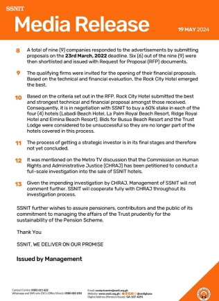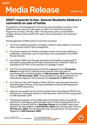 According to the management, since Samuel Okudzeto Ablakwa has mentioned that the Commission on Human Rights and Administrative Justice (CHRAJ) has been petitioned to conduct a full-scale investigation into the sale of SSNIT hotels, it will not comment further, given the impending investigation by CHRAJ.