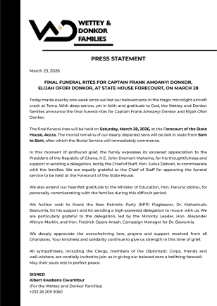 The Wettey and Donkor families have announced that the final funeral rites for Captain Frank Amoanyi Donkor and his brother, Elijah Ofori Donkor, will be held on Saturday, March 28, 2026, at the Forecourt of the State House in Accra; a solemn tribute to two men whose lives were tragically cut short in the microlight aircraft crash that shook the nation earlier this month.