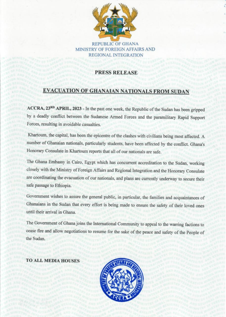The Ghana Embassy in Cairo, Egypt which has concurrent accreditation to the Sudan, working closely with the Ministry of Foreign Affairs and Regional Integration and the Honorary Consulate are coordinating the evacuation of our nationals, and plans are currently underway to secure their safe passage to Ethiopia.