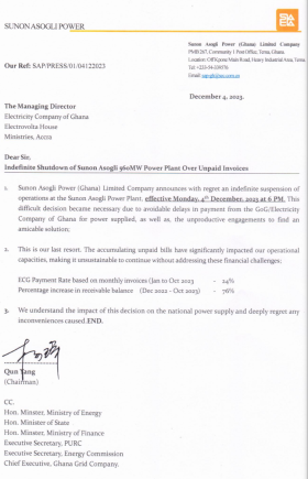 In a letter addressed to the Electricity Company of Ghana (ECG), the company expressed regret over the suspension of operations, citing "avoidable delays in payment from the GoG/Electricity Company of Ghana for power supplied, as well as the unproductive engagements to find an amicable solution" to the financial challenges.