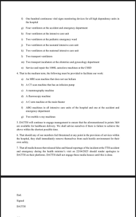 The association is also calling for the installation of 100 continuous vital signs monitors in the high-dependency unit, the provision of 14 ventilators across the ICU, paediatric, neonatal, and maternal units, two transport ventilators, two transport incubators, and the repair of 1,000-litre autoclave machines at the Central Sterile Services Department (CSSD).