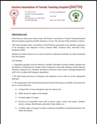The Doctors Association of Tamale Teaching Hospital (DATTH) has declared an indefinite suspension of emergency and outpatient services, effective immediately.