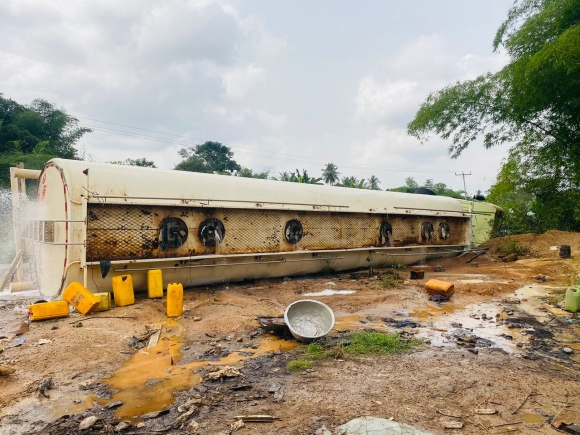 Personnel from the Ghana National Service (GNFS) had to move in swiftly to manage the accident scene and caution road users as residents from neighbouring areas besieged the place to siphon fuel from the accident vehicle.