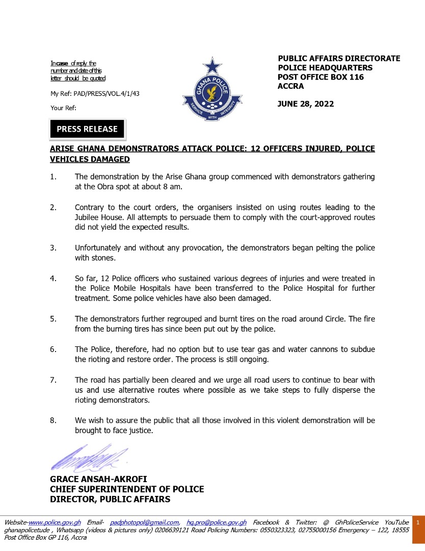 Below is a copy of the police statement signed and issued by Chief Superintendent Grace Ansah-Akrofi, Director of Police Public Affairs