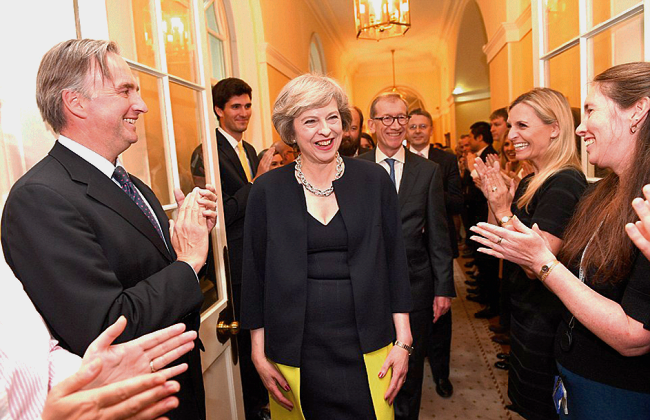 As is traditional for new Prime Ministers, Mrs May was clapped in to Downing Street by staff and aides