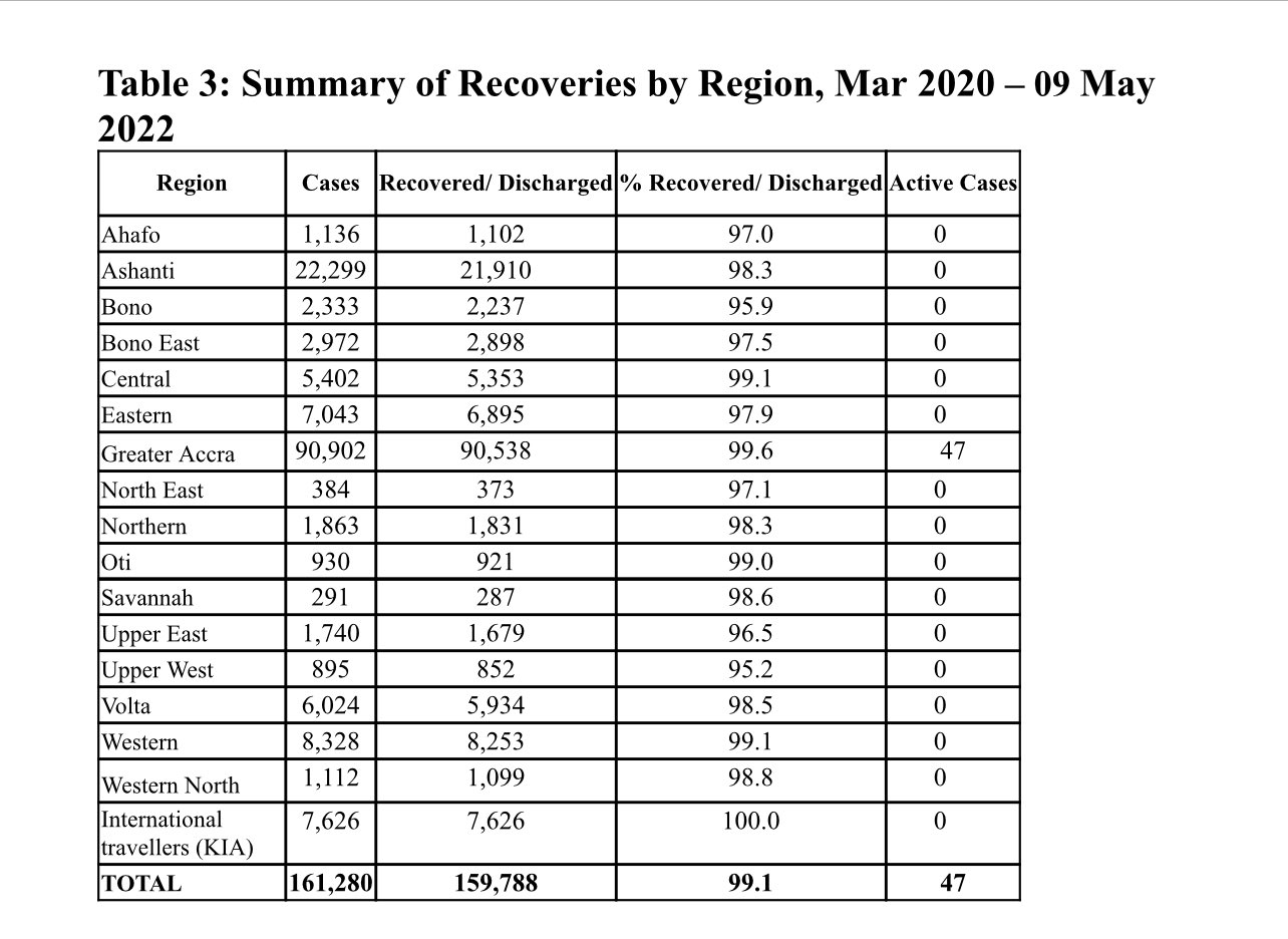 This was contained in figures published by the Ghana Health Service which also indicated that all the 47 active cases were located in the Greater Accra Region with the remaining fifteen regions of the country having no active cases of the illness.