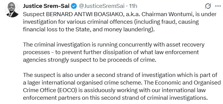 In a post shared on X (formerly Twitter) Dr Srem-Sai confirmed that the Economic and Organised Crime Office (EOCO) is leading the probe, with efforts already underway to recover assets suspected to be linked to criminal activity.