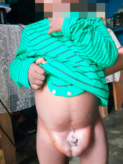 Under his diapers lay an organ that looks like a sexual organ that is lost between that of a male and female. He has an un-descended scrotum with a tiny penis with a hole.
