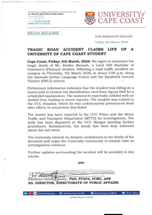 The University of Cape Coast is mourning the loss of a second-year student who succumbed to injuries sustained in a tragic road accident on Thursday afternoon, just as he was preparing to sit for a scheduled examination.