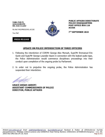 On Thursday morning, the Ghana Police Service in a press statement announced the interdiction of three senior officers due to their involvement in a contentious audio recording, now under parliamentary scrutiny.