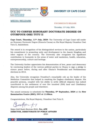 The University of Cape Coast (UCC) has announced plans to confer an Honorary Doctorate Degree on the Asantehene, Otumfuo Osei Tutu II, in recognition of his outstanding contributions to nation-building, peace, and development.