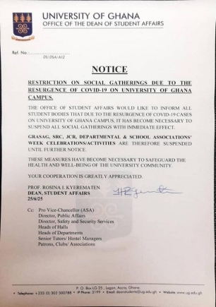 The clarification comes in the wake of a university-wide notice dated June 25, issued by the Office of the Dean of Student Affairs, which announced the suspension of all social events organised by student bodies, including the Student Representative Council (SRC), Graduate Students’ Association of Ghana (GRASAG), Junior Common Rooms (JCR), and departmental associations.
