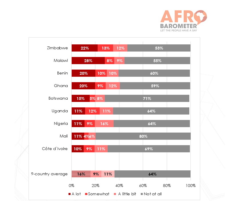 - On average, more than one-third (36%) of respondents across nine African countries say they have considered emigrating, including 16% who have given it “a lot” of thought (see Figure 1). Zimbabwe has the highest percentage of respondents who have given some thought to emigration: almost half have considered emigration “a lot” (22%), “somewhat” (13%), or “a little” (12%).