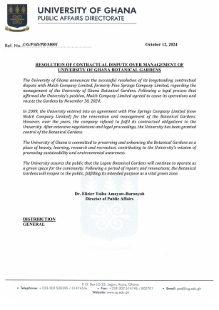 The University of Ghana announces the successful resolution of its longstanding contractual dispute with Mulch Company Limited, formerly Pine Springs Company Limited, regarding the management of the University of Ghana Botanical Gardens.