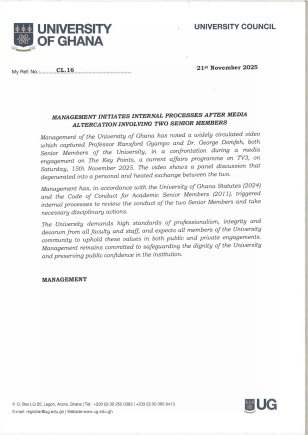 In a statement issued on November 21, management confirmed that it has invoked the University of Ghana Statutes (2024) and the Code of Conduct for Academic Senior Members (2011) to review the conduct of both academics.