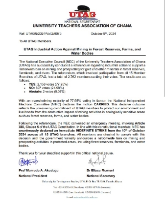 In a statement released by UTAG on Wednesday October 9, 2024, Prof. Mamudu A. Akudugu, National President of UTAG, stressed that this resounding vote reflects the strong commitment of university lecturers to protect Ghana's ecologically sensitive areas from destructive mining activities.