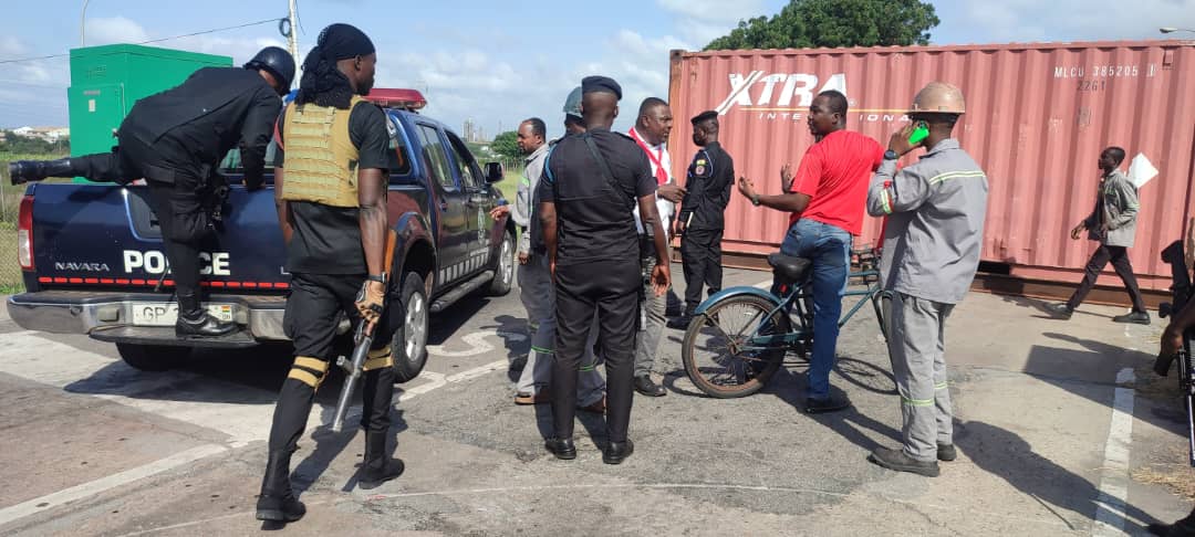 A police deployment team from the Tema Regional Command who were also at the company to ensure law and order pleaded with the protesting workers to remove the container barricade that they had used to block the access to Aluworks.