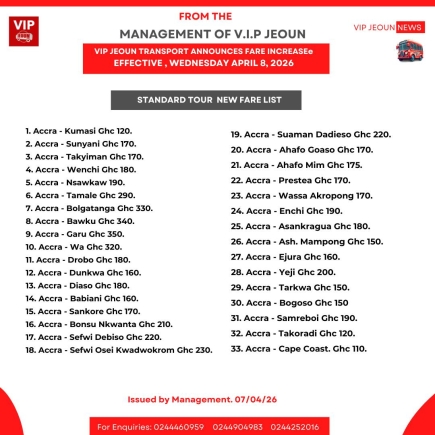 VIP Jeoun Transport has announced a substantial upward adjustment in fares for both its executive coach and standard tour services, effective Wednesday, April 8, 2026.