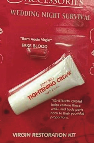 There are so many creams to apply or pills to insert and after sex there will be false blood-like liquid on the bedspread for the woman to score high points as a virgin.