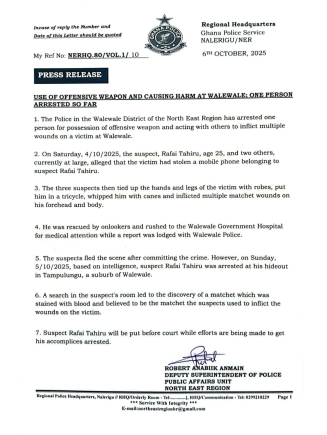The suspects fled the scene after incident but on Sunday, October 5, 2025, and based on intelligence, Rafai Tahiru was arrested at his hideout in Tampulungu, a suburb of Walewale.