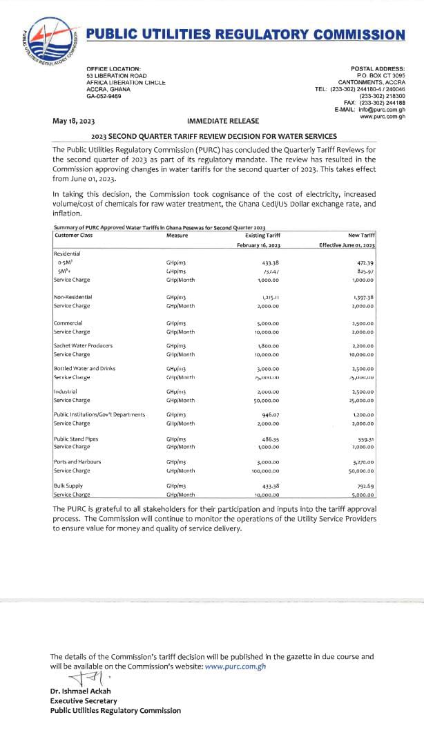 The Public Utilities Regulatory Commission (PURC) has approved a tariff adjustment for water services, which will take effect from June 1, 2023. This adjustment marks an upward shift in costs for all consumer groups.
