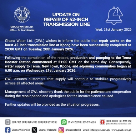 In a public notice issued today, the state-owned utility company confirmed that "repair works on the burst 42-inch transmission line at Kpong have been successfully completed at 20:00 GMT on Tuesday, 20th January 2026." The rupture had impacted production and distribution from a key water treatment facility.