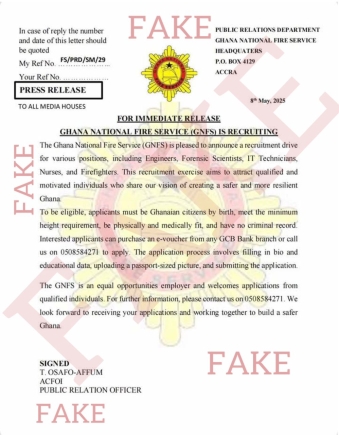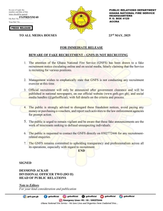 The Ghana National Fire Service (GNFS) has cautioned the public against a fraudulent recruitment notice circulating online, falsely claiming that the Service is currently hiring for various positions.