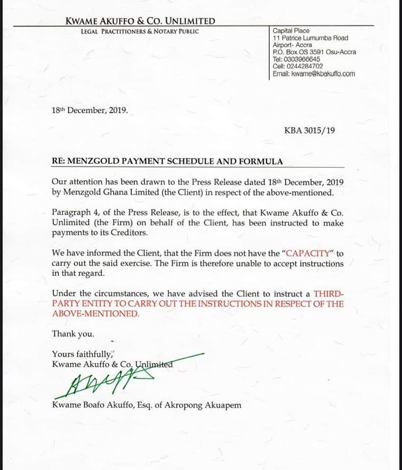 The law firm has, instead, advised Menzgold to “instruct a third-party entity to carry out the instructions in respect of the above mentioned.”