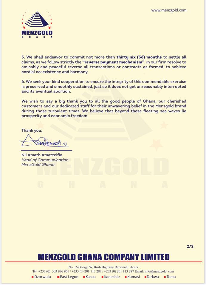 On Wednesday, Menzgold announced that it was commencing payment of customers from Friday, December 27, 2019, for a 36-month period.