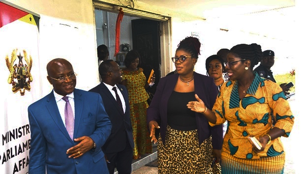 Mr Osei Kyei-Mensah-Bonsu (left) in a chat with some officials from the Ministry of Parliamentary Affairs and Nana Ama Dokua Asiamah Adjei (2nd right), a Deputy Minister of Information.