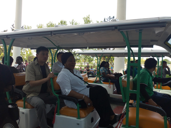 Ms Bocthwey being conducted round a Ghana stand at the Beijing 2019 Expo.