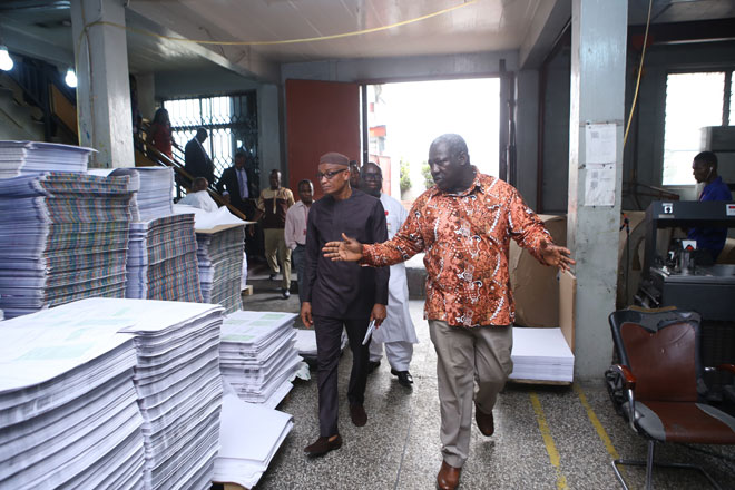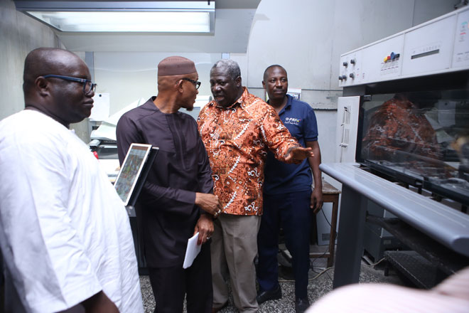 The Managing Director of GCGL, Mr Kenneth Ashigbey and Director of Newspapers, Mr Boadu-Ayeboafoh leading Mr Abdul-Hamid on his tour of Graphic.