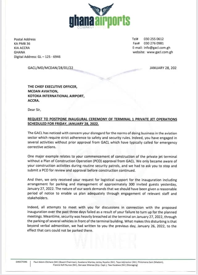 It raised concerns in a letter dated January 27, 2022, a day before the scheduled date for the McDan Group of Companies’ private jet service launch at Terminal 1 of KIA.