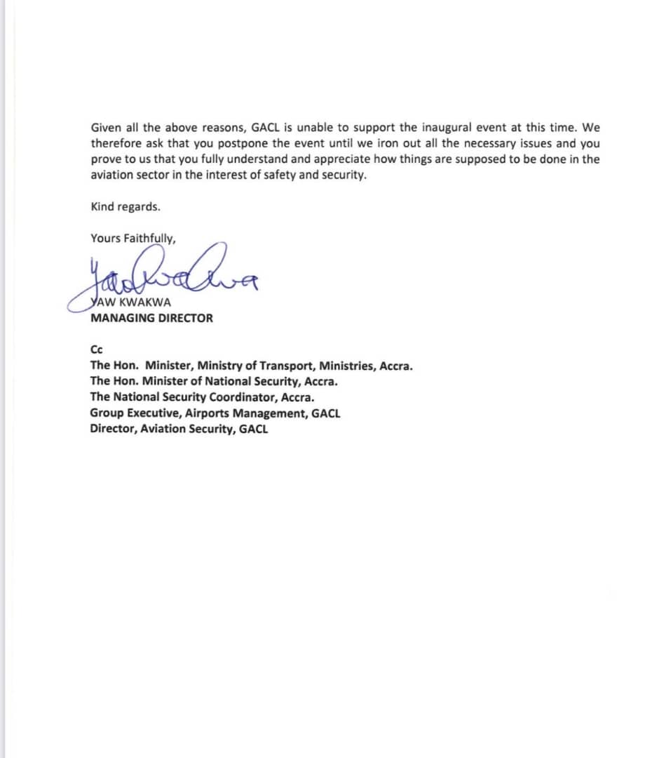 We therefore ask that you postpone the event until we iron out all the necessary issues and you prove to us that you fully understand and appreciate how things are supposed to be done in the aviation sector in the interest of safety and security.