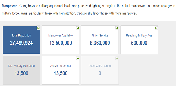 The GFP report also found that the country has 300 armoured fighting vehicles and 20 total naval assets.
