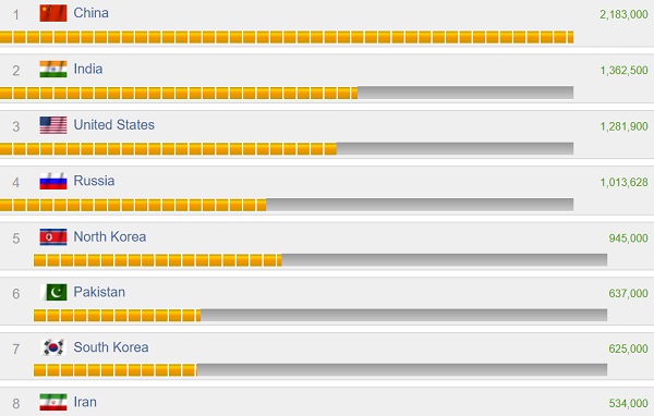 According to the report, although China has more soldiers, the United States of America (USA) with 1,281,900 active military personnel (third on the GFP) has soldiers who are better equipped, with far more resources behind them with a