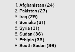 The Afghanistan (24) passport was ranked the weakest followed by Pakistan (27), Iraq (29), Somalia (31), Syria (31), Sudan (36), Ethiopia (36) and South Sudan (36).