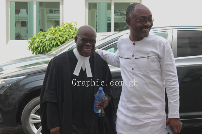 Mr Alfred Agbesi Woyome (left) with his lawyer Mr Ken Anku in court on Thursday.