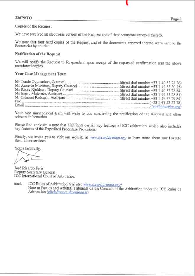 Responding to his petition, the ICC said: “The Secretariat of the International Court of Arbitration of the International Chamber of Commerce acknowledges receipt of your request for arbitration.”