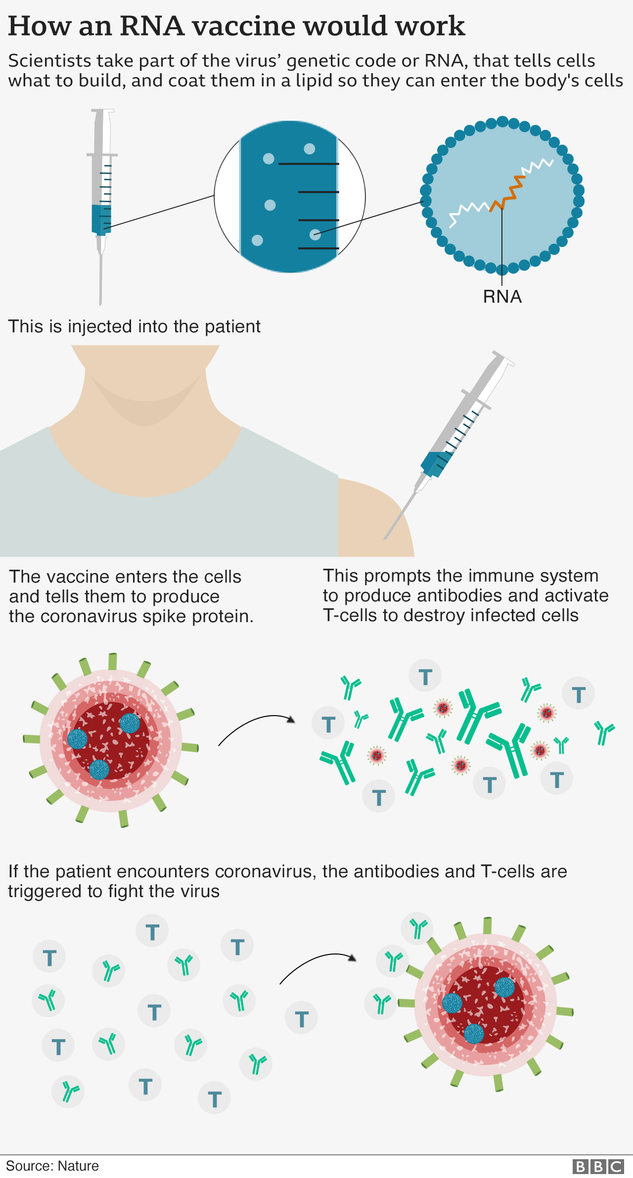 The first two to show any results - made by Pfizer-BioNTech and Moderna - both use an experimental approach, called mRNA, which involves injecting part of the virus's genetic code into the body to train the immune system.