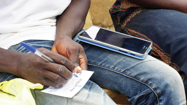 A volunteer issuing the code card to a household member